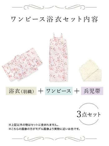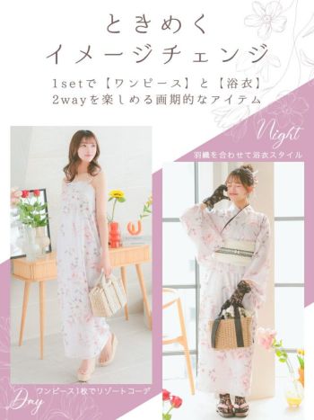 5. 【ワンピース浴衣】ピンク地 ニュアンス 花柄 ガーリー ゆかた3点SET [浴衣羽織+ワンピース+兵児帯]