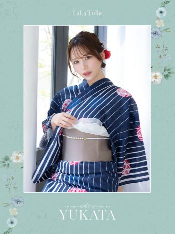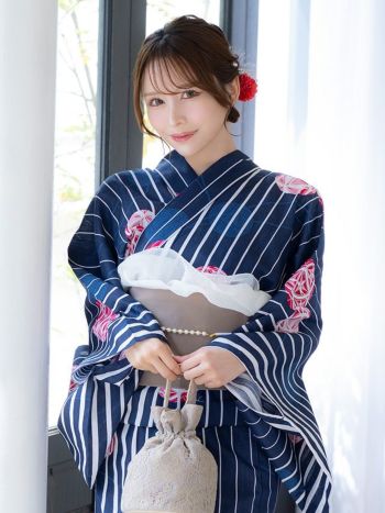 気品さと色っぽさを高める♪ 【浴衣】紺地 縦縞 手毬柄 ゆかた3点SET [浴衣+平帯or作り帯+下駄]