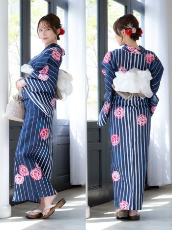 4. 【浴衣】紺地 縦縞 手毬柄 ゆかた3点SET [浴衣+平帯or作り帯+下駄]