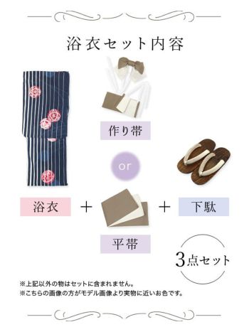 3. 【浴衣】紺地 縦縞 手毬柄 ゆかた3点SET [浴衣+平帯or作り帯+下駄]