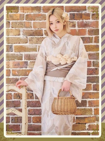 4. 【浴衣】ベージュ地 爽やかボタニカルリーフ ゆかた3点SET [浴衣+平帯or作り帯+下駄]