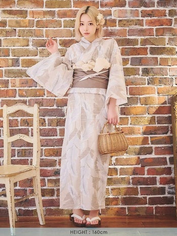 5. 【浴衣】ベージュ地 爽やかボタニカルリーフ ゆかた3点SET [浴衣+平帯or作り帯+下駄]