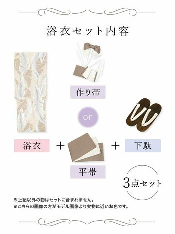 ベージュ地 爽やかボタニカルリーフ ゆかた3点SET [浴衣+平帯or作り帯+下駄]