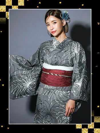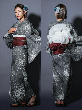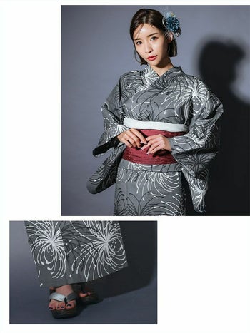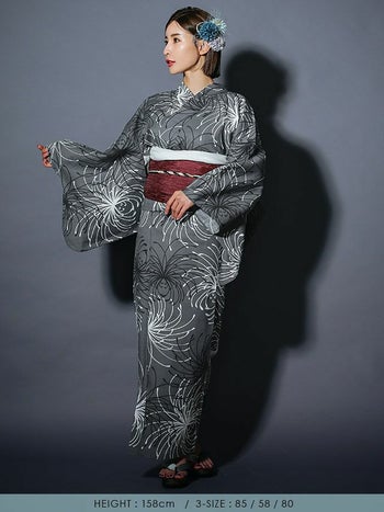 グレー地 モノトーン糸菊の花 ゆかた2点 [浴衣+兵児帯]