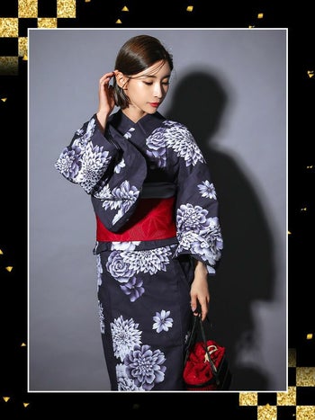 5. 【浴衣】ダークネイビー地 白菊と牡丹 ゆかた3点SET [浴衣+平帯or作り帯+下駄]
