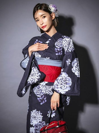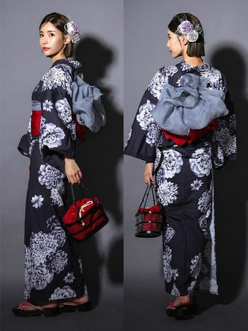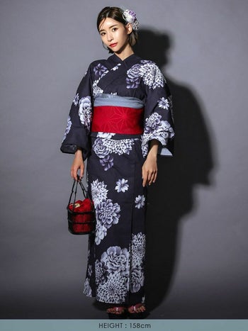4. 【浴衣】ダークネイビー地 白菊と牡丹 ゆかた3点SET [浴衣+平帯or作り帯+下駄]