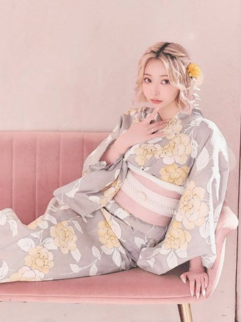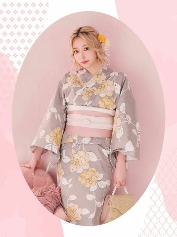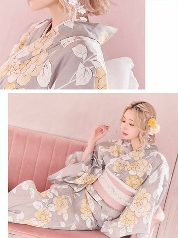 4. 【浴衣】グレー地 黄色牡丹の花 ガーリー ゆかた3点SET [浴衣+平帯or作り帯+下駄]