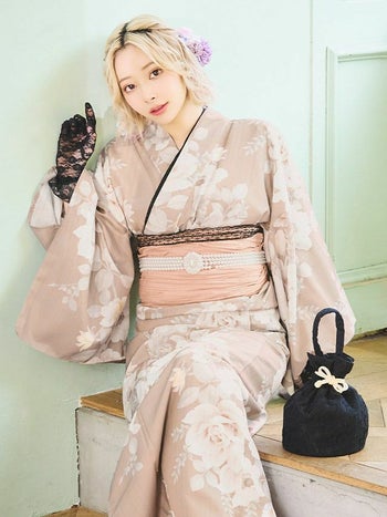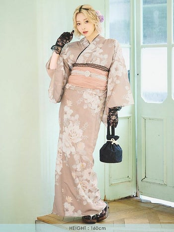 ぴょなちゃんが着る♡スウィート浴衣♪ 【浴衣】ローズベージュ地 アンティークフワラー ゆかた3点 [浴衣+兵児帯+下駄]