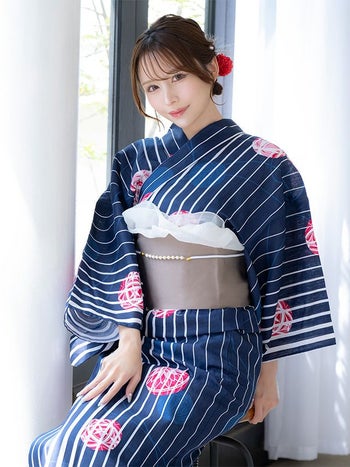 気品さと色っぽさを高める♪ 【浴衣】紺地 縦縞 手毬柄 ゆかた3点SET [浴衣+平帯or作り帯+下駄]