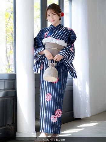 3. 【浴衣】紺地 縦縞 手毬柄 ゆかた3点SET [浴衣+平帯or作り帯+下駄]