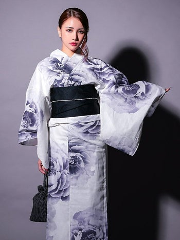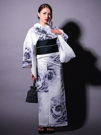 大人かっこいい女性を演出♡ 【浴衣】白地 粋 牡丹 ゆかた3点SET [浴衣+平帯or作り帯+下駄]