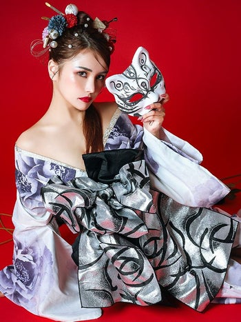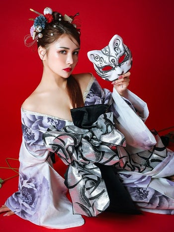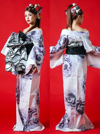 3. 【浴衣】白地 水彩 牡丹柄 2way 花魁ゆかた5点SET [浴衣+下駄+兵児帯+飾り兵児帯+肌襦袢]