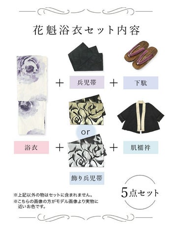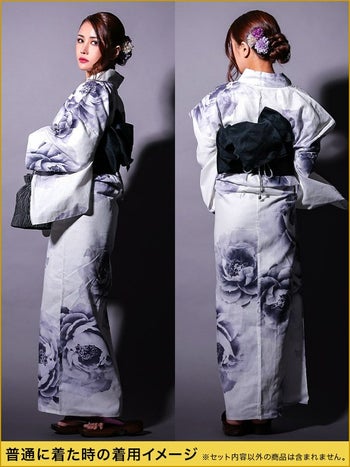 浴衣 白地 水彩 牡丹柄 2way 花魁ゆかた5点SETのセット内容表