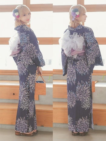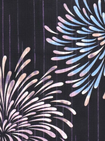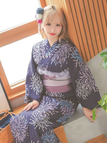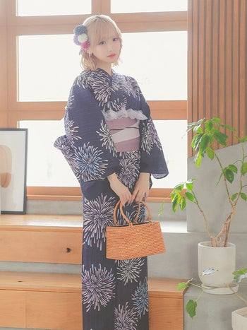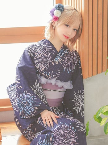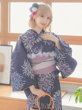 4. 【浴衣】紺地 ピンクグラデーション花火 ゆかた3点SET [浴衣+平帯or作り帯+下駄]