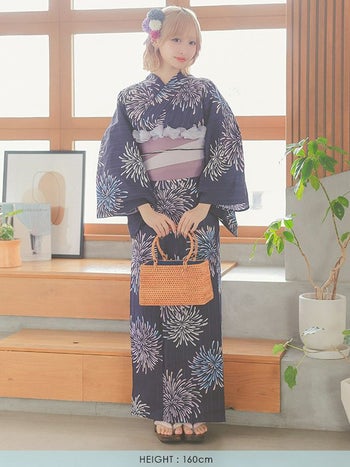 5. 【浴衣】紺地 ピンクグラデーション花火 ゆかた3点SET [浴衣+平帯or作り帯+下駄]