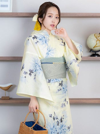 大人綺麗な印象に♡ 【浴衣】クリーム地 ブルー 水彩 菊 レトロ ゆかた3点SET [浴衣+平帯or作り帯+下駄]