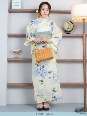 クリーム地 ブルー 水彩 菊 レトロ ゆかた3点SETのサイズ画像