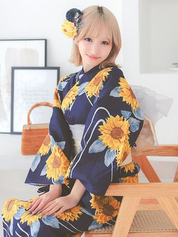 4. 【浴衣】レトロ 紺地 ひまわり 流水柄 ガーリー ゆかた2点SET [浴衣+平帯]