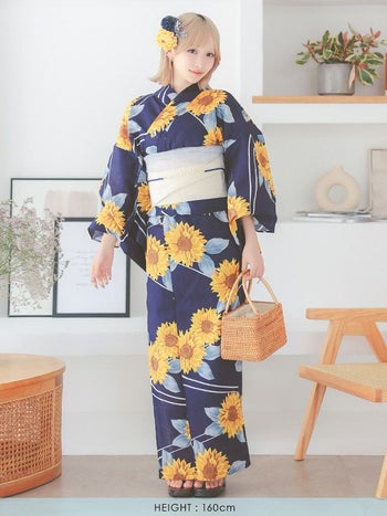 浴衣 レトロ 紺地 ひまわり 流水柄 ガーリー ゆかた2点SET のサイズ画像