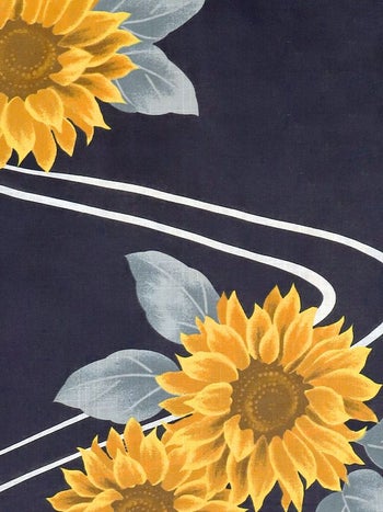 涼しげな青地にたくさんの向日葵が咲き誇る