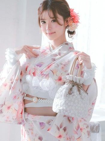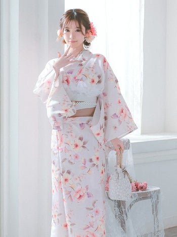 ニュアンスフラワーを全体的にあしらったゆかたセット。