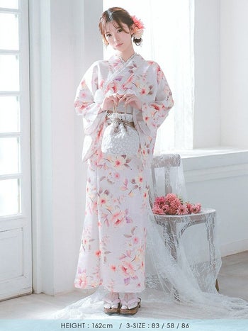4. 【浴衣】ピンク色 花柄 ガーリー ニュアンス ゆかた3点SET [浴衣+平帯or作り帯+下駄]