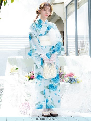 5. 【浴衣】水色地 水彩 紫陽花柄 菖蒲柄 ガーリー ゆかた3点SET [浴衣+兵児帯+下駄]