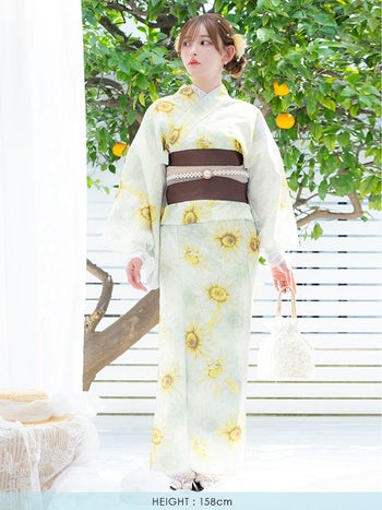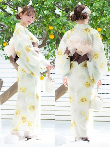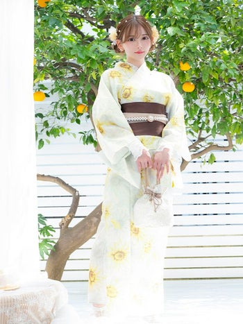 上品なひまわりデザイン♡ 【浴衣】白地 水彩 ひまわり柄 ガーリー ゆかた3点SET [浴衣+平帯or作り帯+下駄]