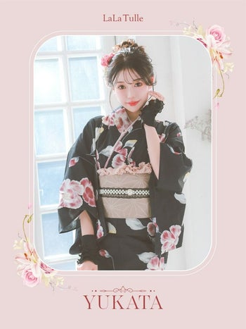 浴衣 黒地 シャクナゲ ガーリー ピンク ゆかた3点SET のイメージ画像2