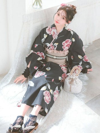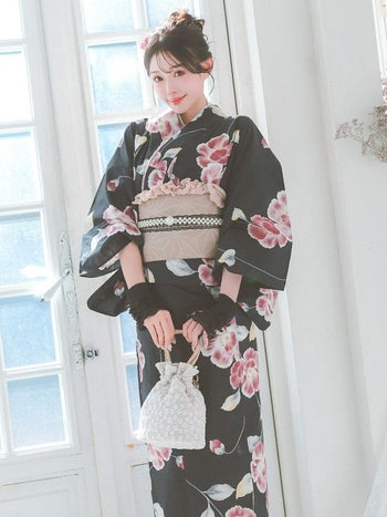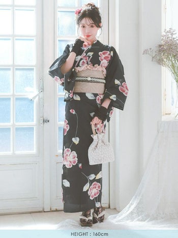浴衣 黒地 シャクナゲ ガーリー ピンク ゆかた3点SET のイメージ画像8