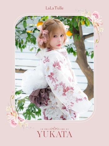 浴衣 白地 牡丹柄 ガーリー ゆかた3点SETのセット画像2