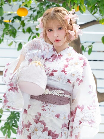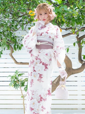 浴衣 白地 牡丹柄 ガーリー ゆかた3点SETのセット画像1