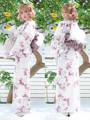 5. 【浴衣】白地 牡丹柄 ガーリー ゆかた3点SET [浴衣+兵児帯+下駄]