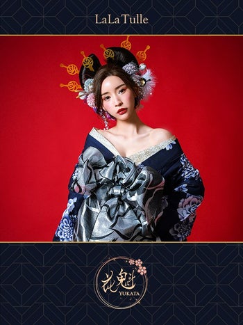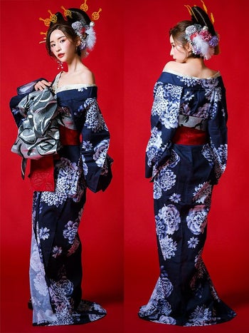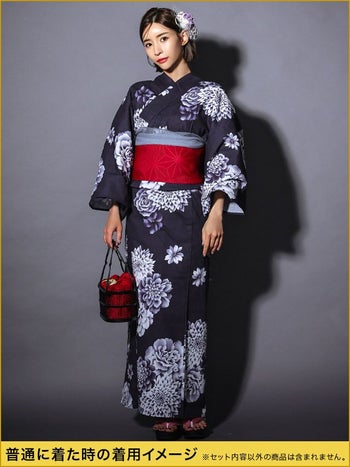 3. 【浴衣】花魁風 濃紺地 菊 牡丹 麻の葉 2way 花魁ゆかた5点SET [浴衣+下駄+兵児帯+飾り兵児帯+肌襦袢]