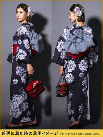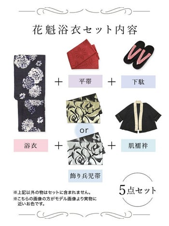 【浴衣】花魁風 濃紺地 菊 牡丹 麻の葉 2way 花魁ゆかた5点SETのセット内容表