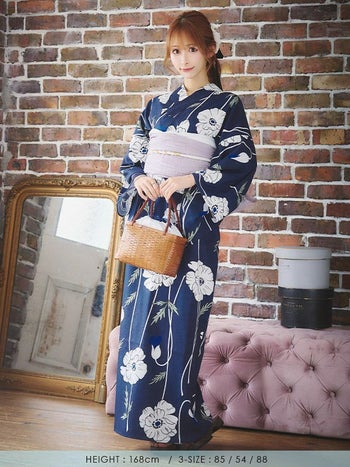 5. 【ワンピース浴衣】2way 線画ポピーフラワー 3点SET [浴衣羽織+ワンピース+兵児帯]
