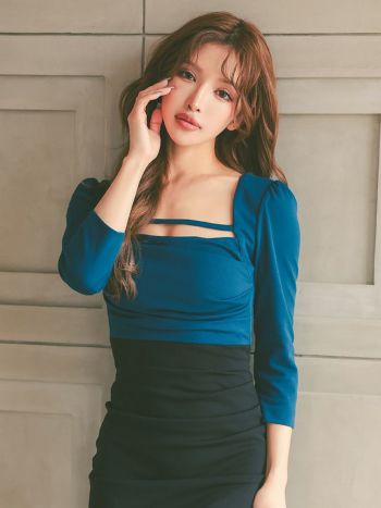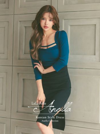 キャバドレス Anella アネラ スクエアネック バイカラー カットアウト 袖あり スリット タイト 膝丈ドレス