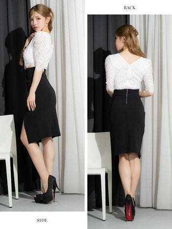 キャバドレス Anella アネラ 袖あり スカラップレース リボン 襟付き スリット タイト 膝丈ドレス