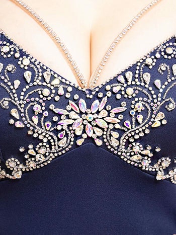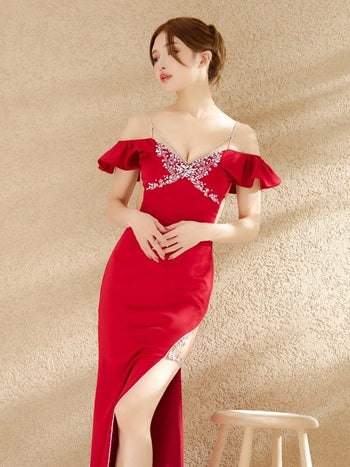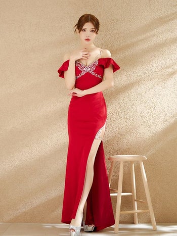 3. 【Angel R/エンジェルアール】オープンバスト 肩あき ビジュー くびれ透け メッシュ スリット フリル エレガント タイトロングドレス (AR24839)