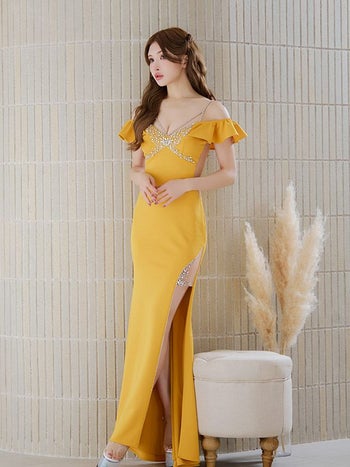 存在感抜群のラグジュアリードレス♡ 【Angel R/エンジェルアール】オープンバスト 肩あき ビジュー くびれ透け メッシュ スリット フリル エレガント タイトロングドレス (AR24839)