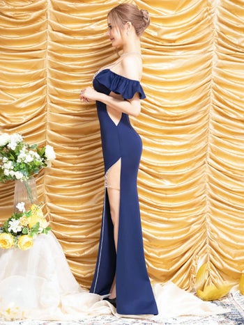 4. 【Angel R/エンジェルアール】オープンバスト 肩あき ビジュー くびれ透け メッシュ スリット フリル エレガント タイトロングドレス (AR24839)