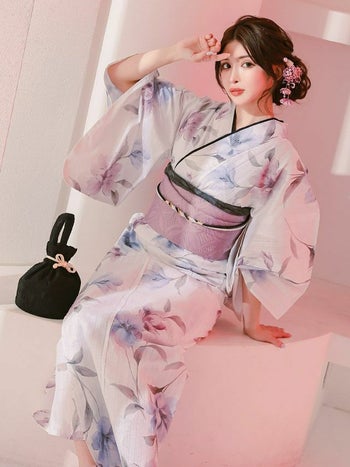 4. 【浴衣】水彩フラワー 白地 妖艶 ゆかた3点SET [浴衣+平帯or作り帯+下駄]