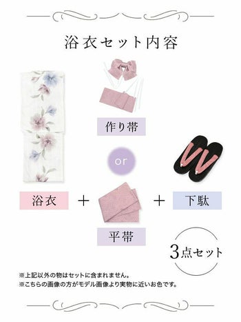 3. 【浴衣】水彩フラワー 白地 妖艶 ゆかた3点SET [浴衣+平帯or作り帯+下駄]