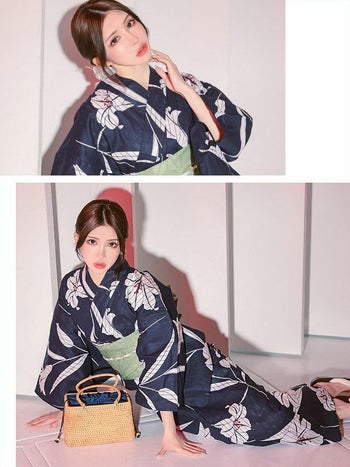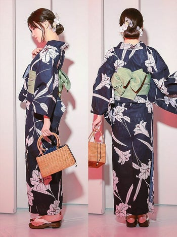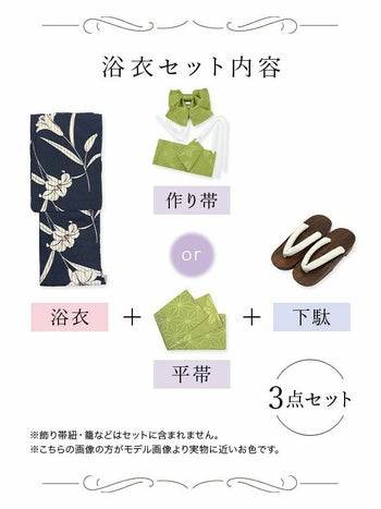 3. 【浴衣】紺地 白百合柄 ゆかた3点SET [浴衣+平帯or作り帯+下駄]