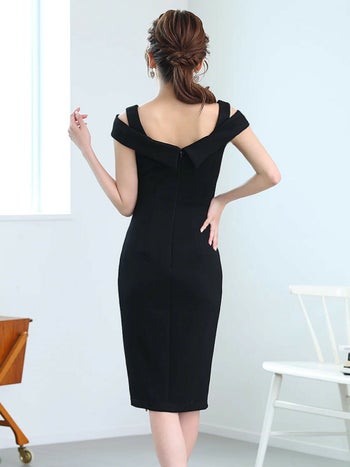4. 【Veautt/ヴュート】ウエストマーク ボタン ジップデザイン ワンカラー 肩あき スリット セクシー 膝丈ドレス (VT082410)