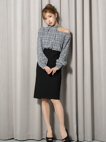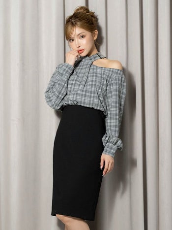 4. 【Veautt/ヴュート】チェック柄 長袖 モノトーン 肩あき チョーカー風 長袖 モノトーン タイト 膝丈ドレス(VT082529)