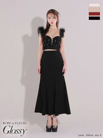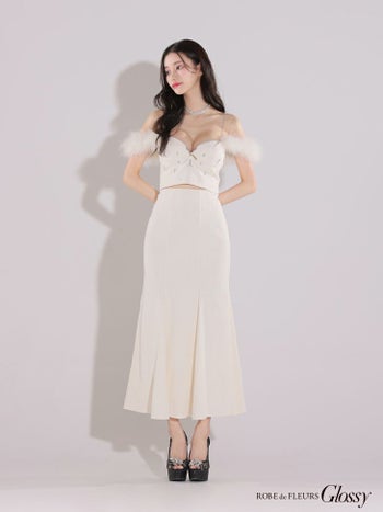 4. 【Glossy by ROBE de FLEURS/グロッシー】オープンバスト ジップデザイン ビジュー 肩あき チェーン フェザー セットアップ セクシー マーメイドロングドレス (GL3749)