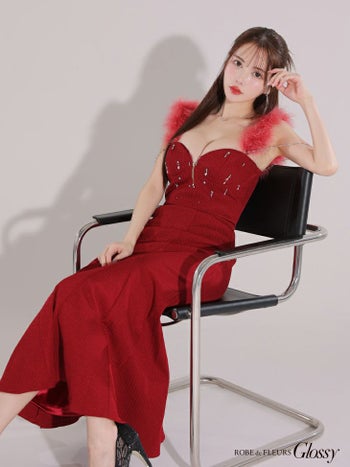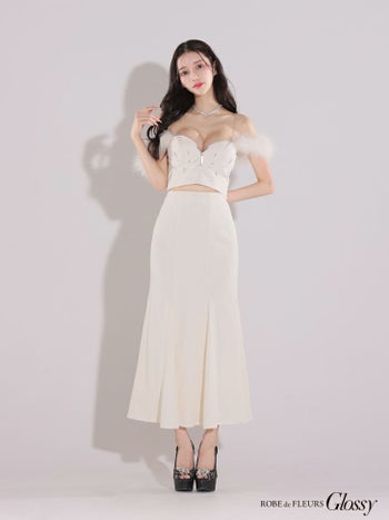 3. 【Glossy by ROBE de FLEURS/グロッシー】オープンバスト ジップデザイン ビジュー 肩あき チェーン フェザー セットアップ セクシー マーメイドロングドレス (GL3749)