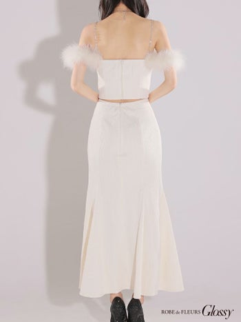 XS~Lあり!肩フェザーがCUTE☆ 【Glossy by ROBE de FLEURS/グロッシー】オープンバスト ジップデザイン ビジュー 肩あき チェーン フェザー セットアップ セクシー マーメイドロングドレス (GL3749)