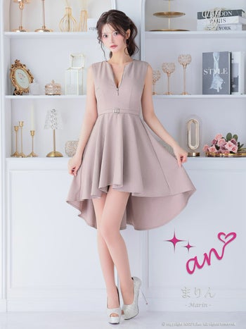 キャバドレス an ジップデザイン ノースリーブ ウエストベルト ビジュー フリル ロングテールドレス